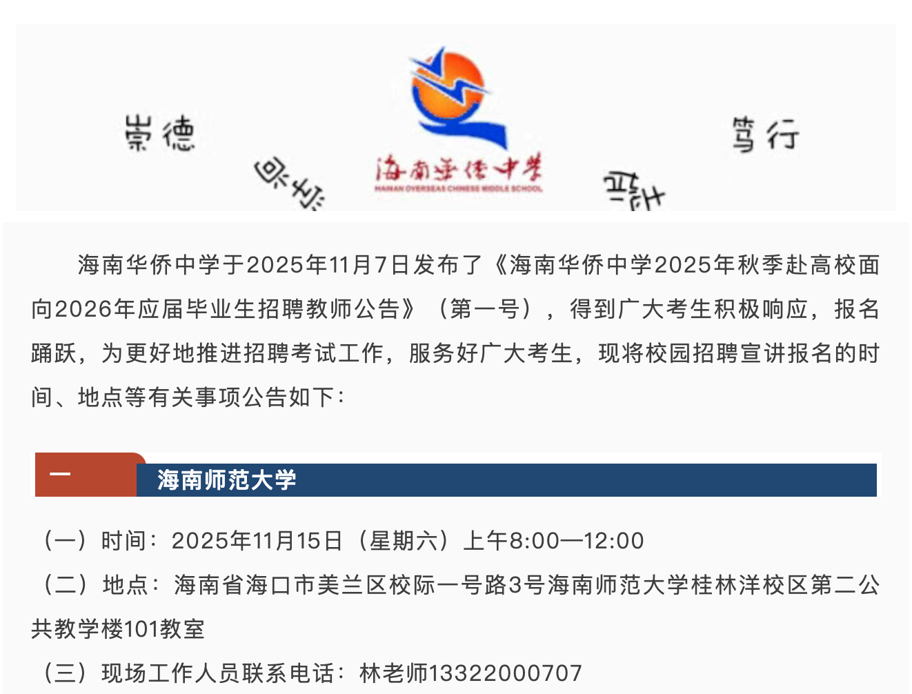 海南华侨中学2025年秋季赴高校面向2026年应届毕业生招聘...